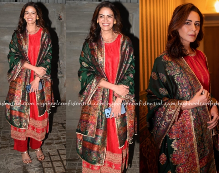 Mona attended a movie screening wearing a red suit from Shraddha Rambhia and while that dupatta was super pretty, I wish she’d draped one side of it under the shoulder around the hip. As is, it looked awkward.