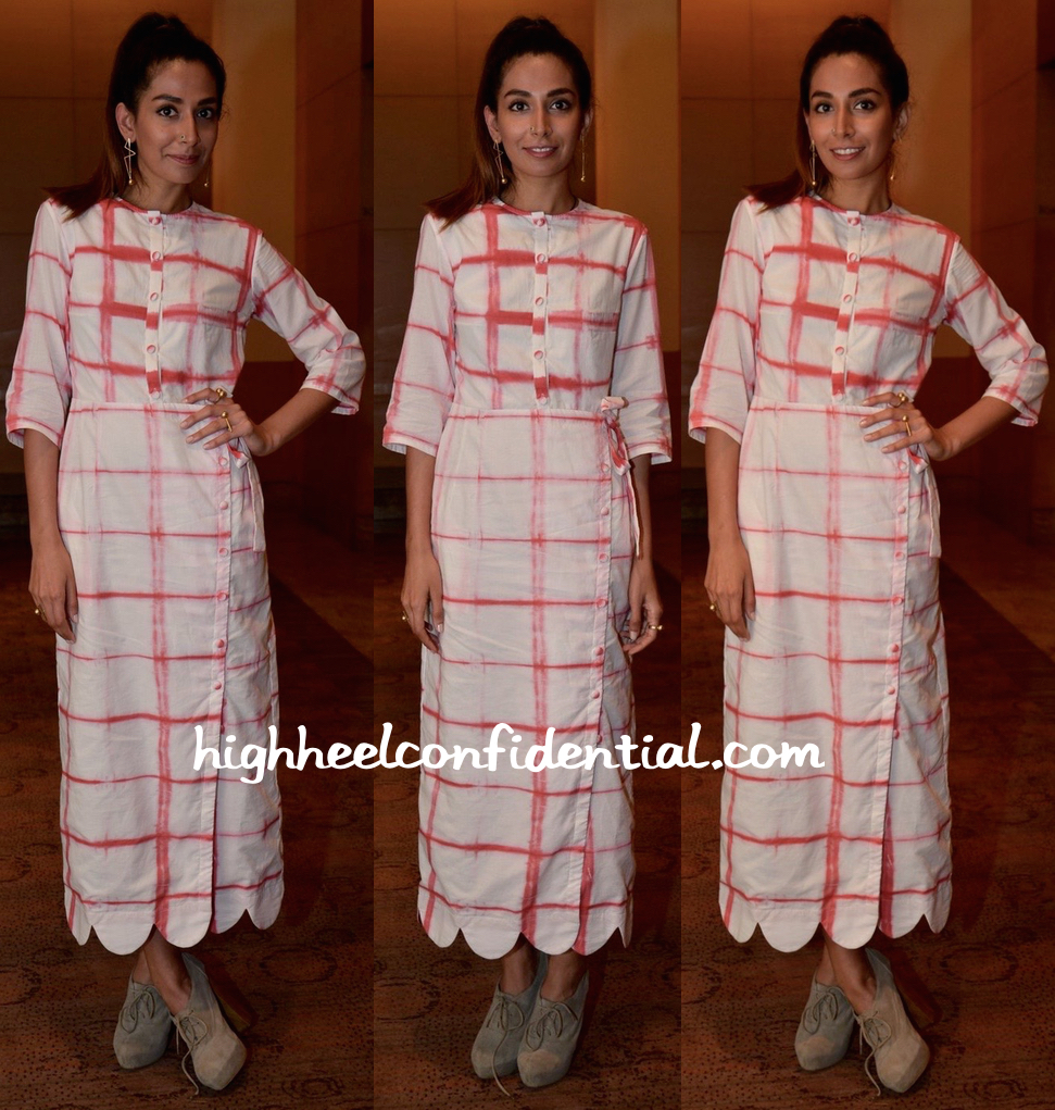 It was a Ka-Sha dress for Monica who was a panelist at the ongoing Luxury Conference in Mumbai. Love the dress, but then I do have a thing for scalloped edges! With her hair in a ponytail, Monica finished out the look with jewelry from Misho Designs and suede booties. She looked good!