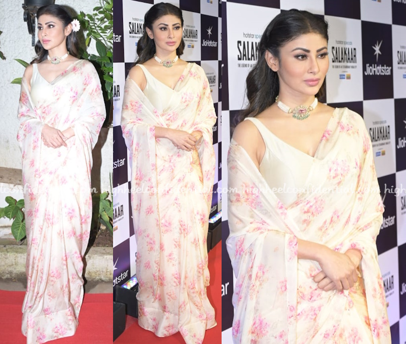 At the screening of her series, Mouni was seen in a floral silk sari paired with a simple pearl choker and a flower in the hair. I liked that she skipped on earrings and added the flower. She looked nice.