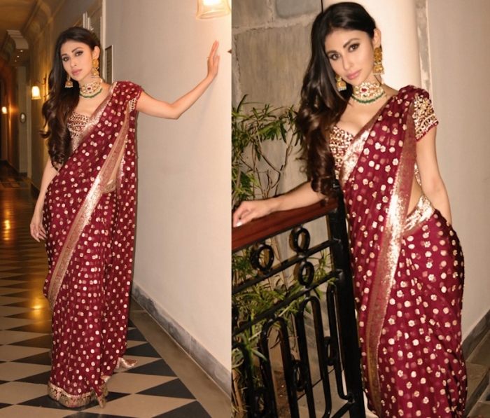 Mouni attended the Sanon-Ben wedding reception on Tuesday evening wearing a jewel toned ivory tissue sari and blouse from Aangiwali with jhumkis and a maang tikka. A gold Sabyasachi clutch finished out her look. These aangi blouses have embroidery pattern that is very tongue-in-cheek and I kind of love it.