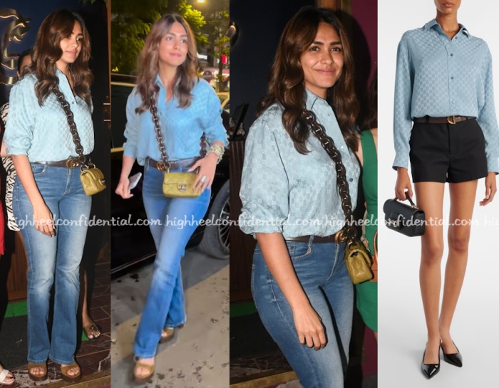 Mrunal grabbed dinner with some of her friends from the industry and was seen in a blue logo shirt from Gucci paired with denims and a Chanel bag. She looked good in it.