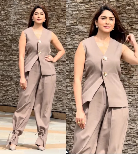 At promotions for her movie, Mrunal was seen in a vest and pant set from Manière De Voir. To me, the knot detail giving off this tapered silhouette wasn’t working. Like what you see?
