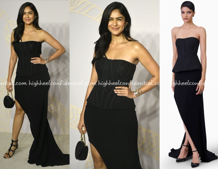 Mrunal wore a strapless corset and maxi skirt set from Rohit Gandhi + Rahul Khanna paired with a Bvlgari Serpenti Cuore bag and a Serpenti watch. She didn’t look bad per se but something about those particular sandals bringing down the elegance of the look a bit.