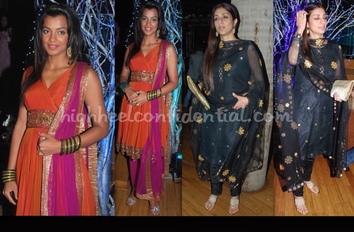Both these lovely ladies chose to go the kurta-and-churidaar route and while Mughda embraced color, it was a more understated black-and-gold for Tabu.