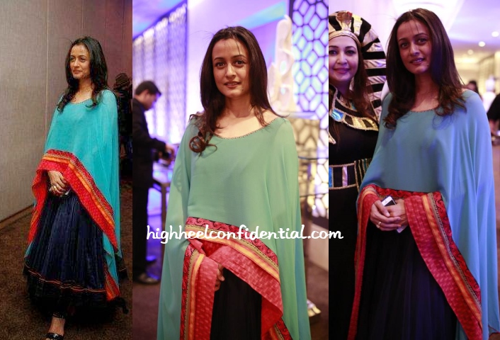 I think she looks lovely the way she is. Dupatta stiched to the anarkali is so unique – why didnt someone think of that earlier ! Its event appropriate and more importantly, she has a certain serenity to her… A bit like AR Rahman’s wife – she can be drowning in fabric but you can never complain – its just suits her.