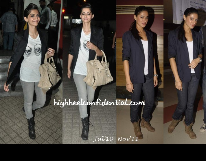 nargis is stunning but the fitting of those jeans and the colour of those boots totally kills her look.! cant look past it ! sonam on the other hand, chooses her colour combo perfectly ! i also love her hair ! 🙂