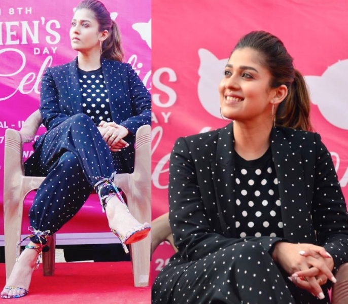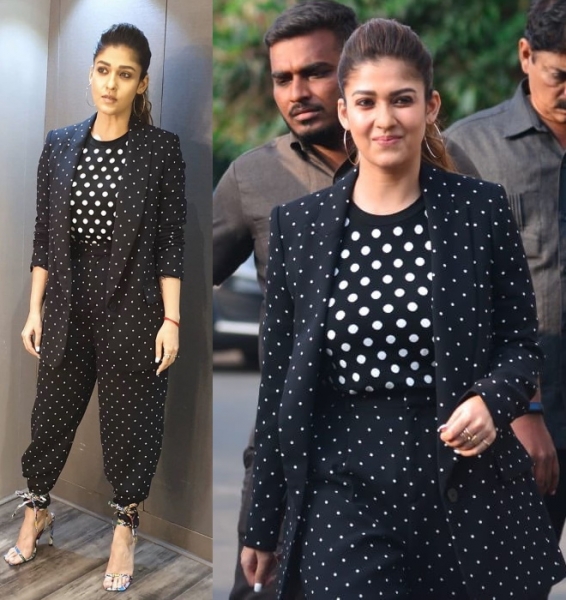 Nayanthara attended an International Womens Day event in March wearing a polka dot pantsuit with a polka dot tee and colorful strappy sandals. Like the dots on dots combo on her?