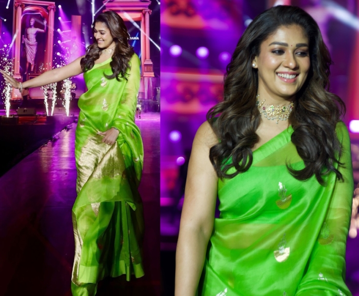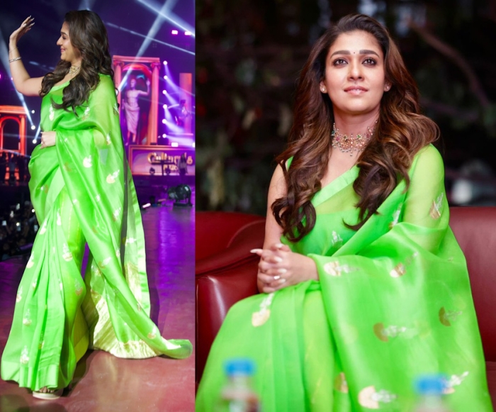 Nayanthara attended a university cultural program this past weekend wearing a lime green Chanderi sari from Neela By Anu Vardhan paired with a dainty choker. She had me at the color.