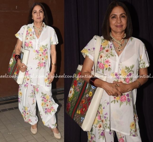 Neena was spotted a few months ago wearing a floral kurta and matching dhoti pants and a floral painted Gucci tote. You’d think that was one floral element too many but she pulled it off effortlessly. Loved this outfit on her.