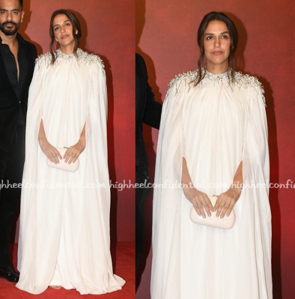 Neha attended the Gaurav Gupta Couture show presentation wearing a white caped gown from the designer with her hair in an updo. Having gone sleeveless in black yesterday, I get Ms. Dhupia wanting to do white today but that just feels like a whole lotta fabric on her.