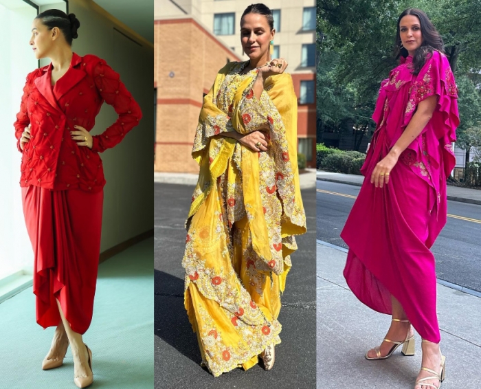 It’s been Anamika Khanna designs for Ms. Dhupia for recent events with the actress sporting two draped skirts designs and one caped one from the designers. Have a favorite? Mine would have to be the yellow. Classic AK.