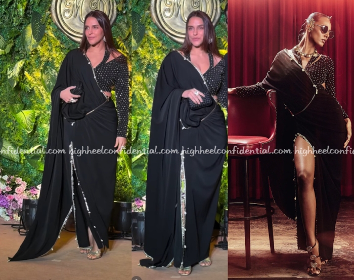 Neha attended a wedding reception on Saturday wearing a SVA sari-inspired set. Between that cut-out blouse and the awkward drape pallu starting slanted below the waist, I had no love for this design and Ms. Dhupia should’ve totally not picked this look. Funnily, someone else also wore this set (see inside) and it didn’t look that great on that person either.