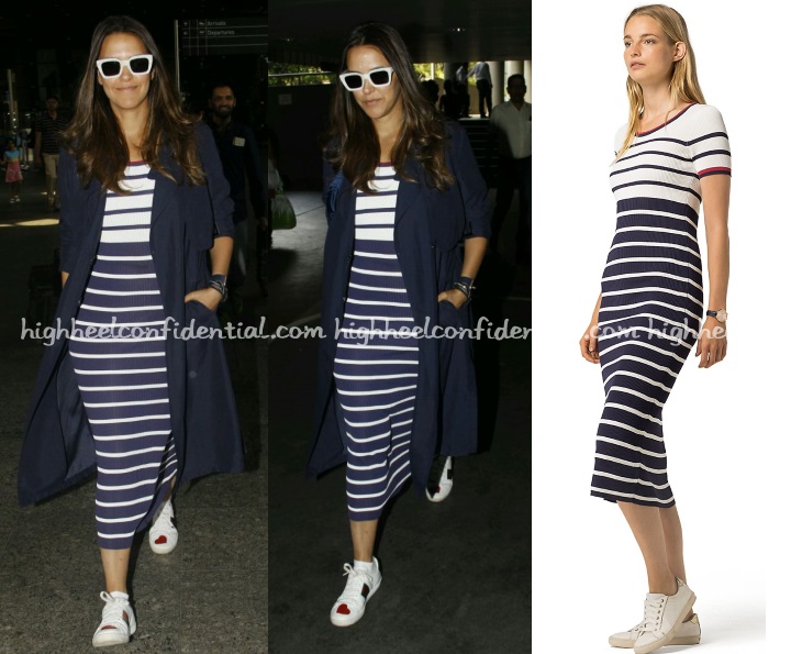 Neha was spotted arriving back in Mumbai wearing a striped Tommy Hilfiger midi dress with a navy trench and her Gucci sneakers. A comfortable airport look that we’d definitely wear. Would you?