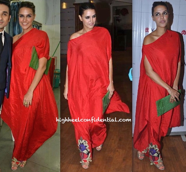 Umm….ok I guess somebody needs to point out that the emperor is naked. Those pants are hideous, thanks especially to that gaudy floral applique and although that dress/kurta/tunic (whatever) works well in theory, being relaxed and roomy, it is making her look twice her size (in an unattractive way). Ms. Dhupia deserves the right to catch a break from her form fitting clothes definitely, but this circus tent is not the way to go.