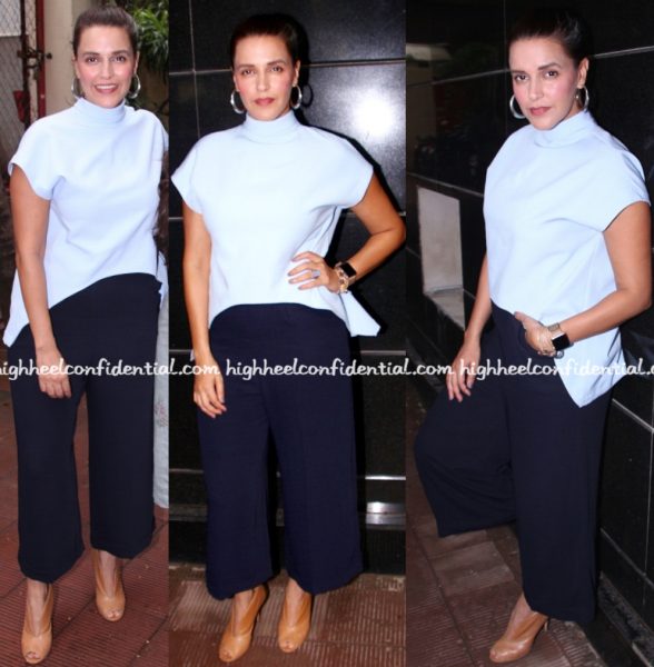 Wearing Deme By Gabriella separates, Neha taped an episode of her radio show. With her hair pulled back, the actor rounded out the look with hoop earrings and tan booties. She wore her look well!