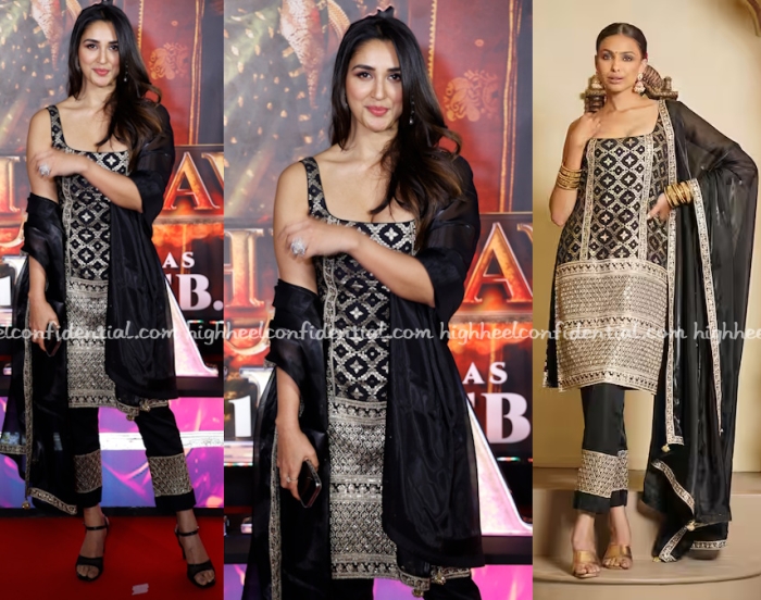 Nikita attended a screening on Thursday wearing a brocade kurta suit from Monk & Mei by Sonia Anand and while I didn’t mind the kurta here, wasn’t really liking that embellished on the churidaars with the extra band of black below. Instead of giving the illusion of longer legs, it actually has the potential to make one look shorter.