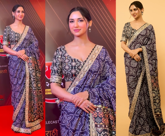 Nikita attended an awards event wearing a bandhej and ajrakh sari from Nitya Bajaj with simple drop earrings. I liked that she kept her jewellery simple to contrast the busy pattern.