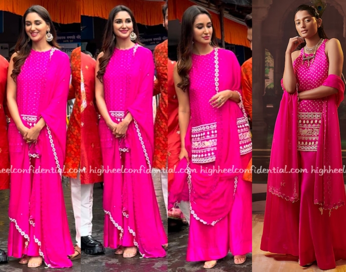 Nikita joined her castmates as they visited a temple ahead of the release of their movie and was seen in a sharara from Pink City By Sarika. The fuschia color was striking and I liked the simple styling.