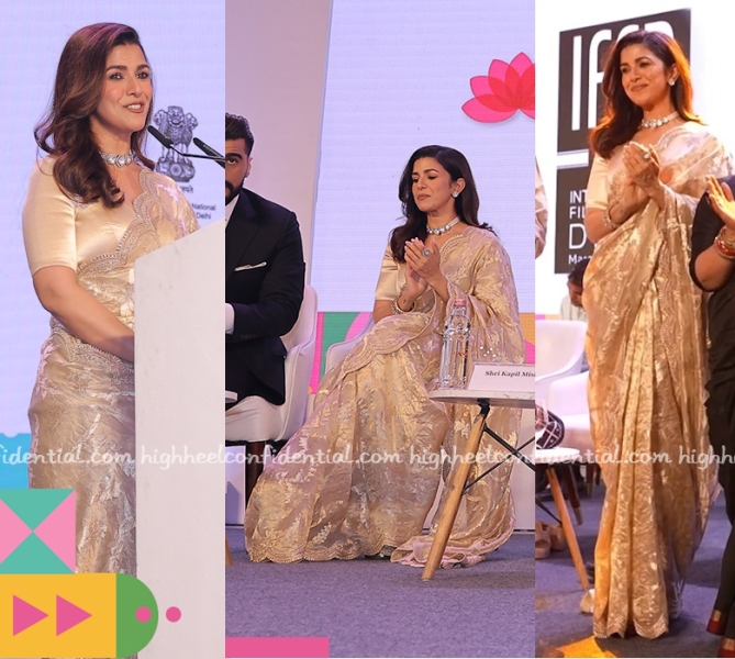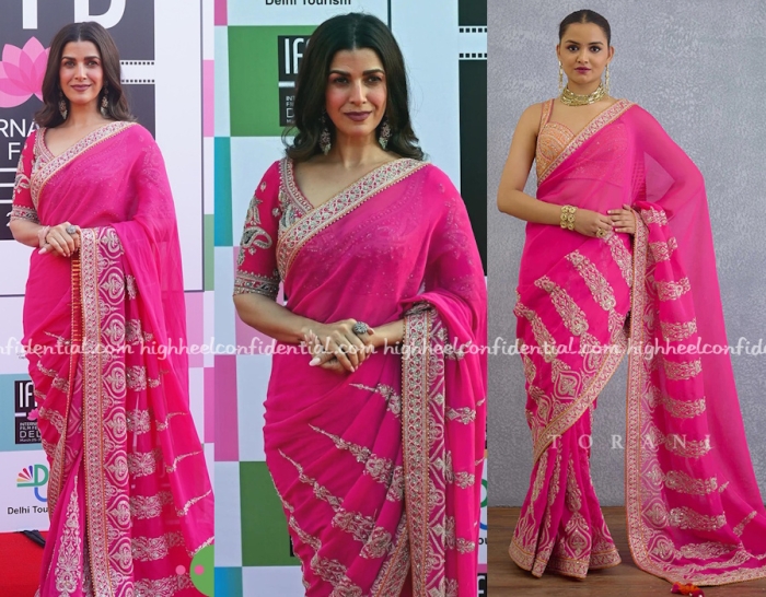 Nimrat was seen at the International Film Festival of Delhi in saris, first in one from Ekaya and then in a pink one from Torani. She looked nice in both but I was gravitating more towards the Ekaya. You?