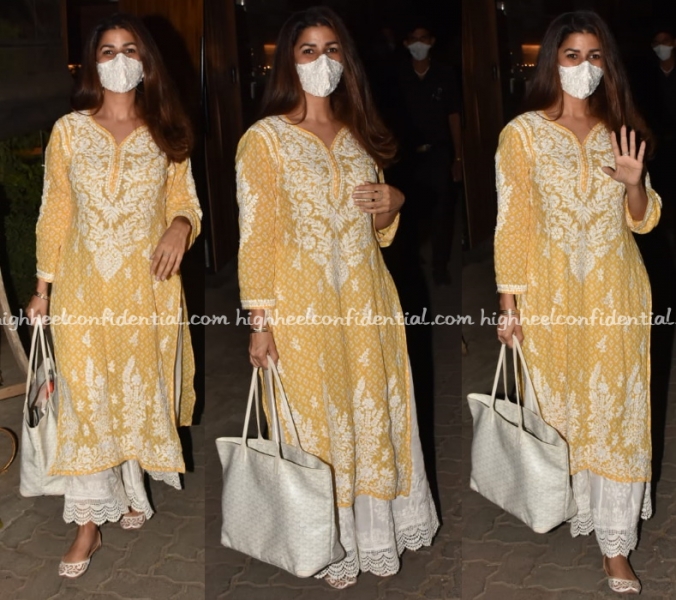 Wearing a printed yellow kurta with a white sharara and juttis, Nimrat was spotted out and about on Wednesday evening. She looked lovely.