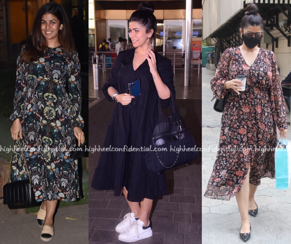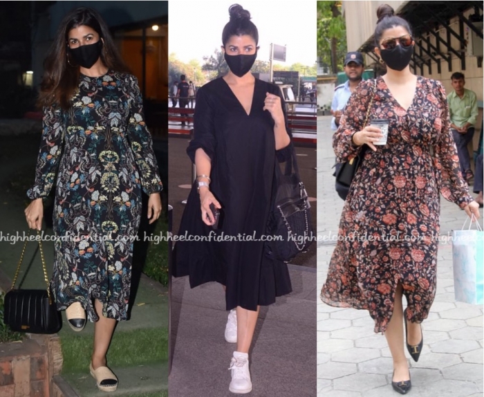 While out in Mumbai, Nimrat was photographed wearing easy fuss-free dresses, dresses that she paired with just as easy shoes and her trusty bags. Of the three, I like the black dress best. That said, a minor gripe as it is, wish she had teamed the dress with either of the other two pairs of flats instead of the sneakers she had on.