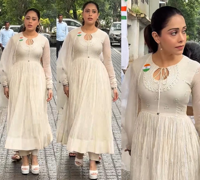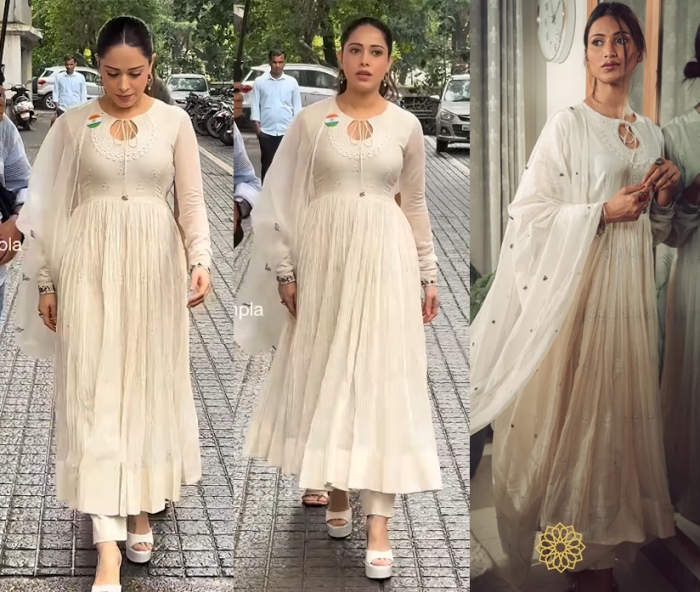 Nushrat attended a flag hoisting ceremony on Friday wearing a white anarkali from Rhua. I wish she’d worn tan sandals instead of those stark white ones because instantly the eyes are drawn to them instead of the anarkali.