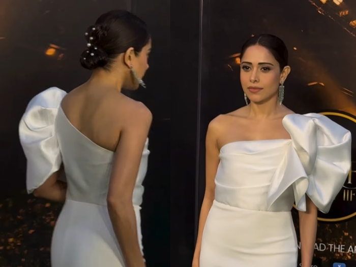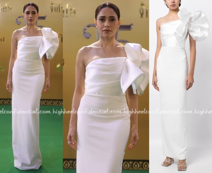 Nushrat was seen at the IIFA Digital Awards on Saturday evening in a white one-shouldered gown from Solace London. Hair in a middle-parted updo with pearl accents, her look was finished out with diamond drop earrings. She looked elegant here.