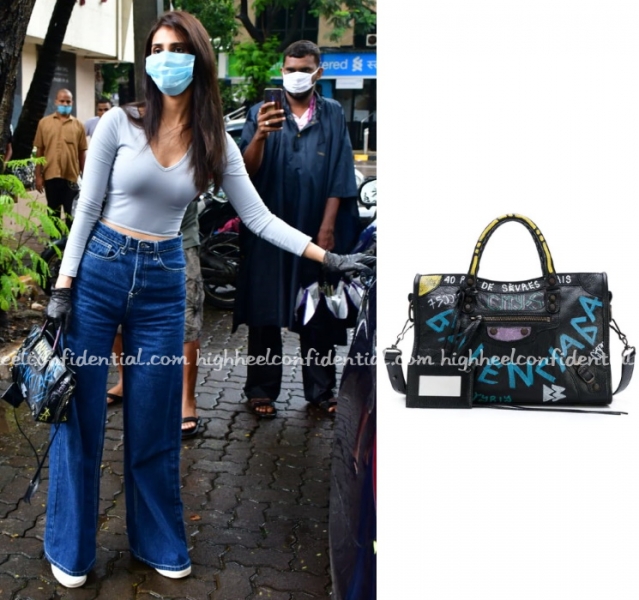 Vaani was clicked on Sunday out and about in her wide-legged denims, sneakers and Balenciaga tote, this time paired with v-neck grey top. Catch her wear the two with a neon one here.