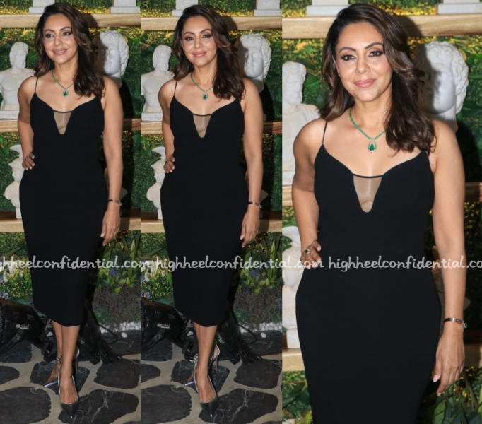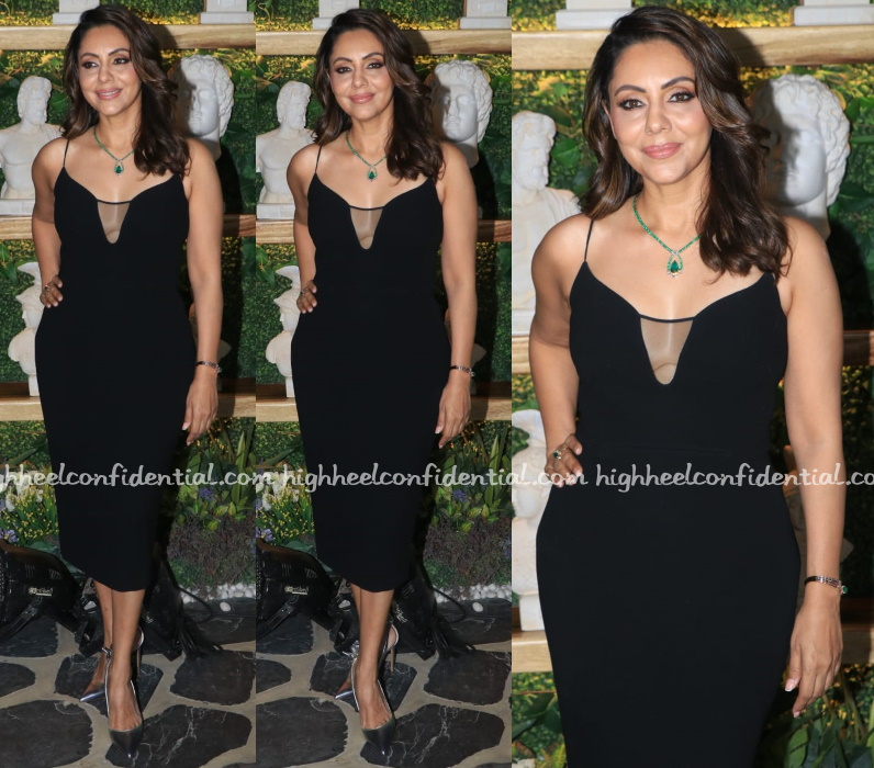 Wearing a midi black dress by Victoria Beckham, Gauri attended the collection showcase of a bag brand on Thursday evening. The necklace here seemed like an odd pick to me, but she looked fabulous regardless.