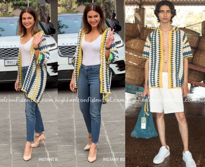 Kriti was spotted at a production house attending a meeting wearing a crochet shirt from IM WIP paired with a white top and skinny ankle-length denims. Like the shirt?