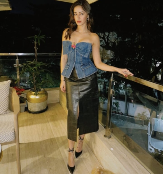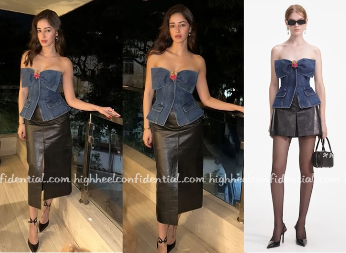 Ananya posted pics of herself on social media wearing strapless Self-Portrait denim top and a midi leather skirt paired with Aquazurra sandals. Now that I’ve seen the model wear it with the mini-skirt, found the proportions of the top working better with the mini. Just me feeling that way?