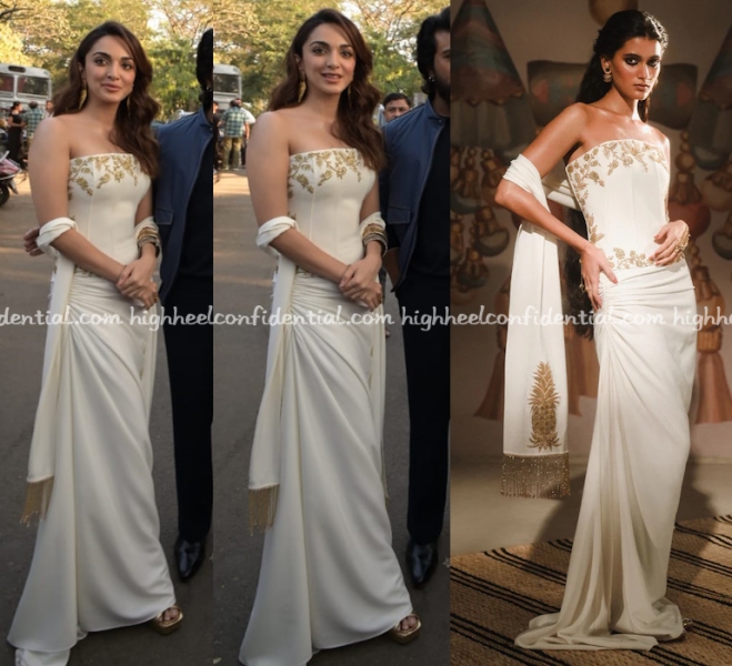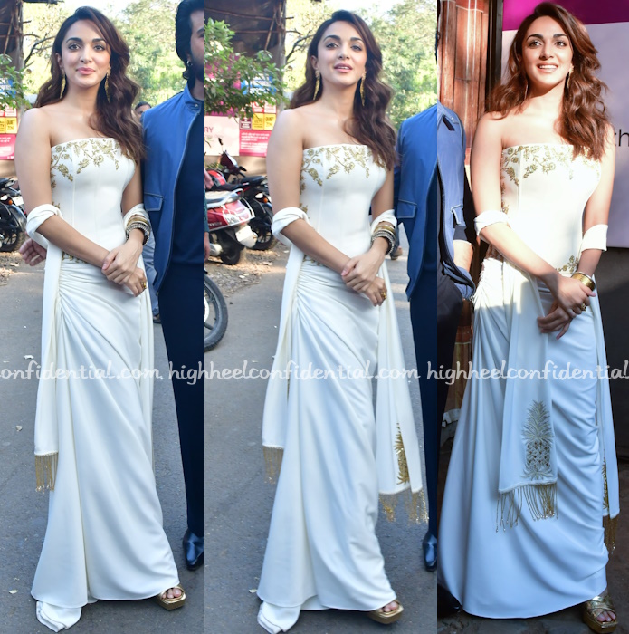 Kiara attended promotions for her upcoming movie wearing a strapless gown from Masaba which also included a fringe stole. She looked nice in it.