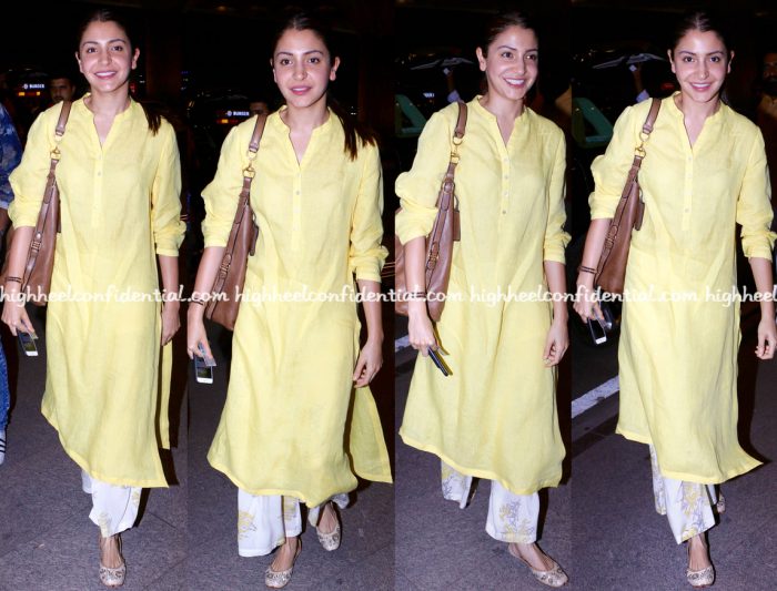 Wearing a summery suit with a pair of jootis and a tan shoulder bag, Anushka was photographed as she exited the airport in Mumbai. There’s no faulting this easy, off-duty look.