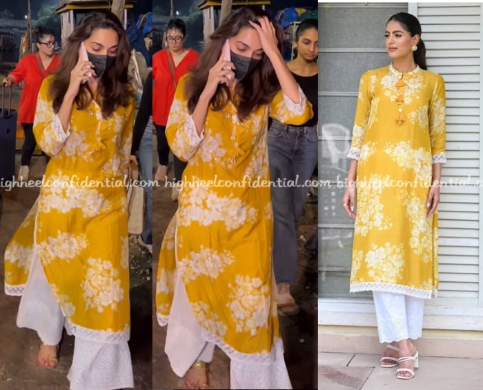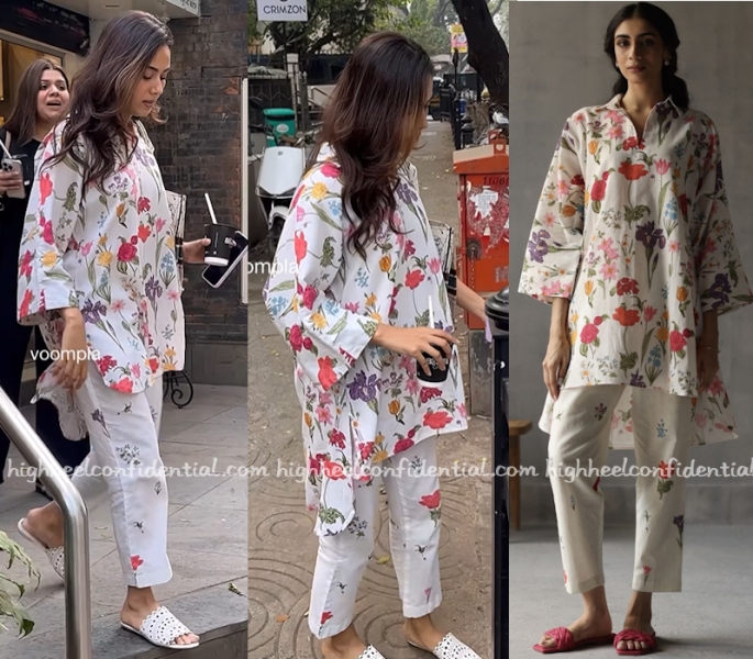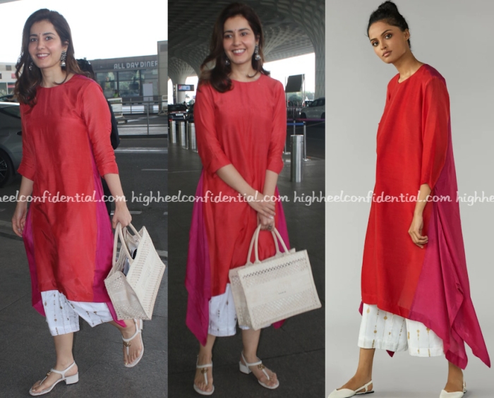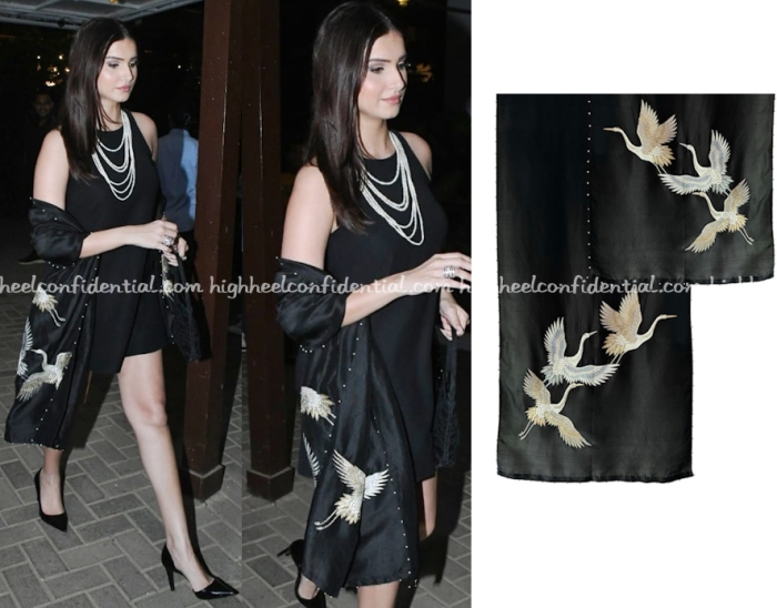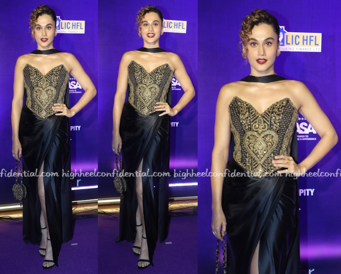 At an awards event, Taapsee was seen in a draped sari-inspired gown featuring an embroidered corset from Torani paired with a matching heart shaped bag by the label. Wasn’t loving the hairdo with those tendrils here. You like?