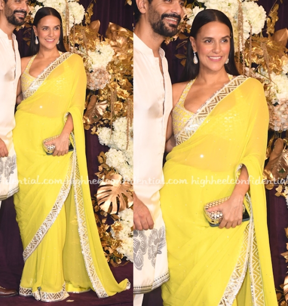 Neha was seen at the Malhotra Diwali party wearing one of his simpler fares sari but but in a bright shade of yellow. Ms. Dhupia travelled out of Mumbai in the morning and that is possibly why her makeup and hairdo is on the simple side as well. She probably just travelled back and immediately dressed up for the event.