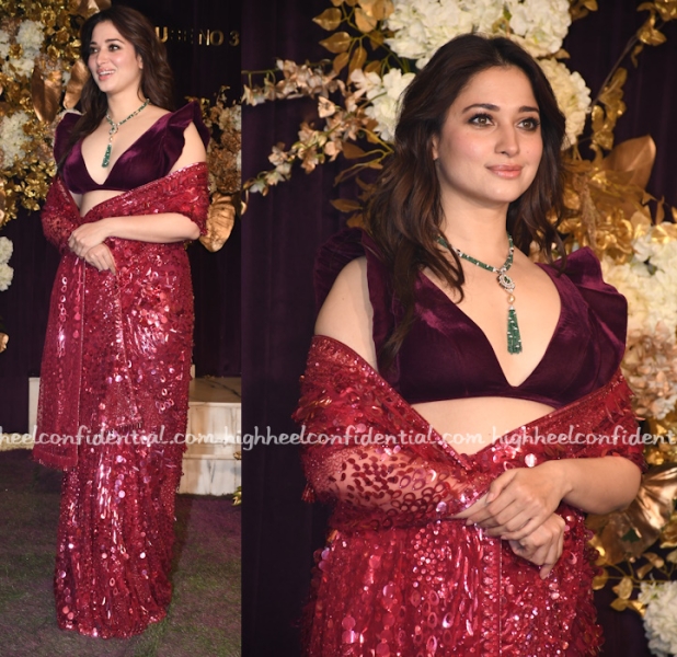 Tamannaah wore a sequin red sari by Manish to his Diwali party which came with a darker shade ruffle blouse. Where do I even start? A) I don’t get how you pair that jhatak a sari with a velvet blouse ruffle blouse. Makes no sense. B) A contrast jewel is most effective when you’ve got two colors. Here, with the sari being a red and the blouse a darker one, we had three shades in play and each color fighting for attention.