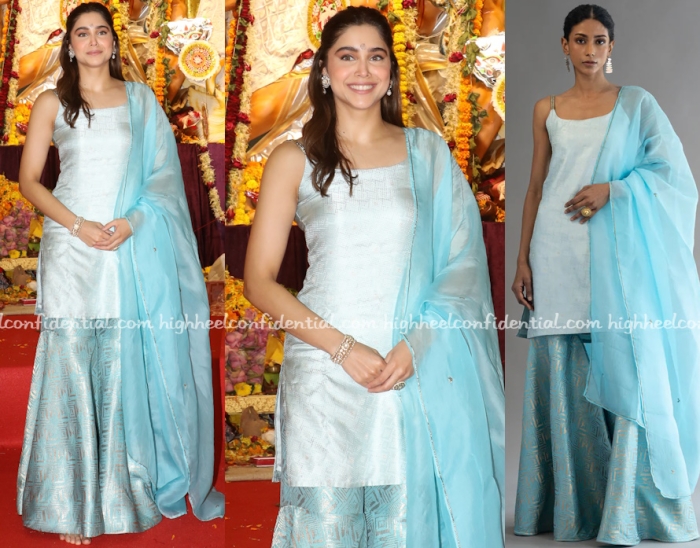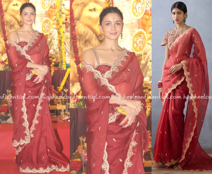 For dashami, Kajol opted for a red and white weave mimicking the Bengali laal paar but she draped it the nivi way. The motifs on the pallu again are confusing me about the source.