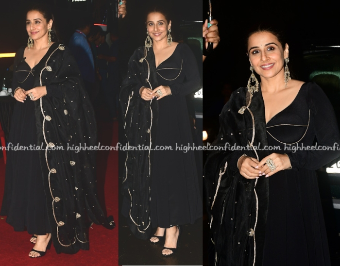 Vidya attended promotions on Saturday wearing a black flared kurta and churidaar Anjana Bohra set with black sandals and gold statement earrings. She looked great in it!