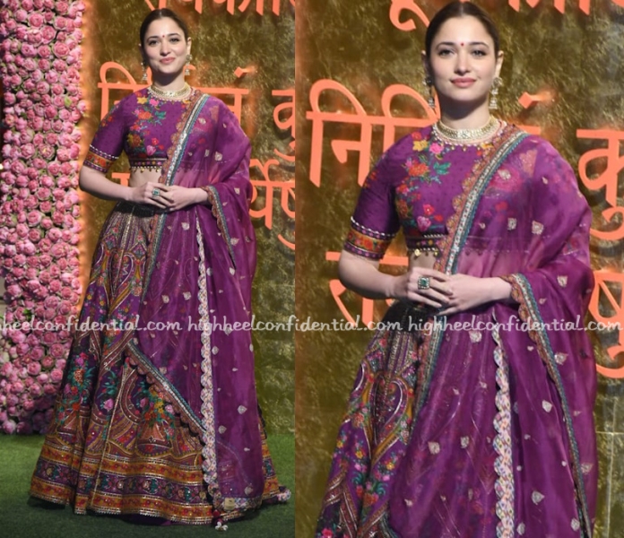 Kajal opted for a Nidhi Tambi Kejriwal sari to wear to the Ambani Ganesh Chaturthi celebrations. That has got to be a very heavy sari considering those lines are not sequins but actual embroidery. Having said that given the sari was so rich wish the the blouse matched the richness as well. It looked like it was made out of inexpensive material.