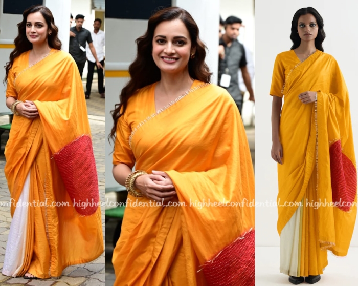 Promotions for her series saw Ms. Mirza in a sari from Medium paired with gold bangles. Loved the sari and her in it. You?