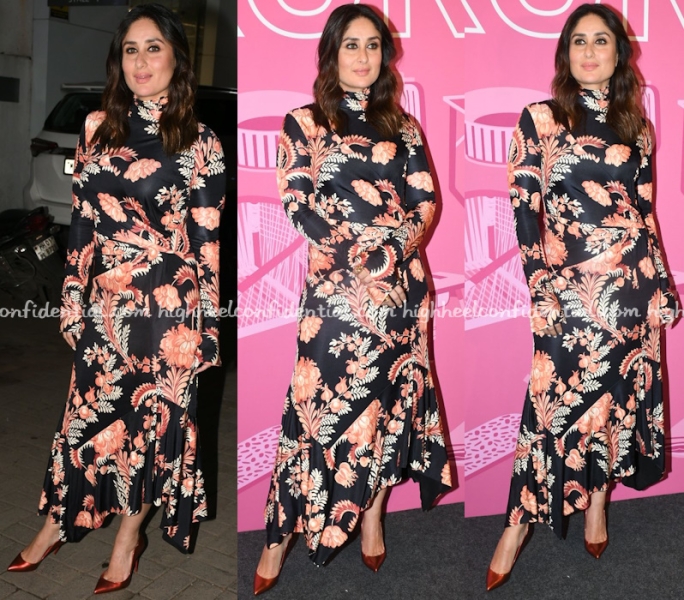 At an event for a furniture brand, Kareena was seen in a printed gloved dress from Etro paired with metallic pumps. It’s a busy print but it was different and I liked this on her. Better than wearing pink here to match the brand colors. What say you?