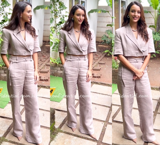 Tripti was spotted out wearing a linen cropped jacket and pants set with pumps. These cropped jacket sets are not my cup of tea but she looked nice.