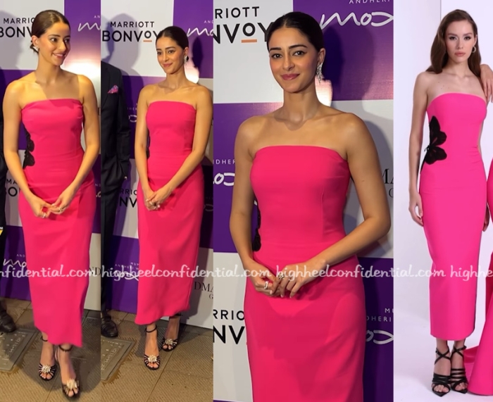 At the opening of a lounge on Saturday evening, Ananya was seen in a strapless dress from Nour Fathallah. Hair in a sleek bun, her look was finished out with mismatched earrings and black ankle-strap sandals. She looked nice.