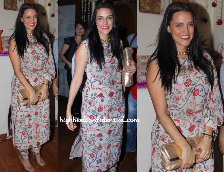 Neha celebrated Eid at Jaaved Jaaferi’s house wearing a floral Payal Singhal churidaar kurta. Now, between the one-shoulder and all-over pattern, I shouldn’t be liking this look, but I do. Minus the beads, of course. With the high neckline, didn’t think she needed it.