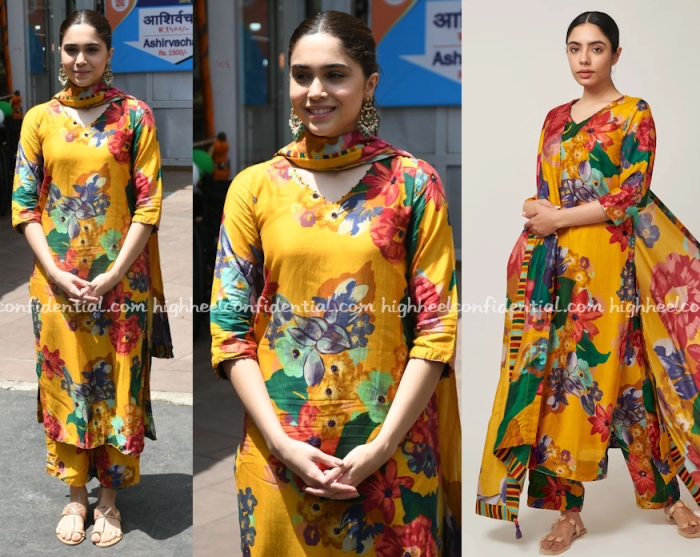 Prior to the release of her movie, Sharvari visited a temple to seek blessings wearing a yellow floral print kurta set from Itraake paired with kundan wearings and kolhapuri chappals. We all know this was a fully curated look even if it was the temple. But, having said that, this was a good outfit. She looked great!