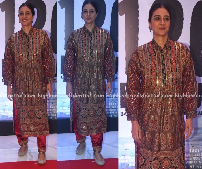 Neha was spotted attending a private event wearing a printed jumpsuit from Clos with flats, a yellow bag and blue drop earrings. I actually like the jumpsuit ended almost at the floor vs how it was ended on the model.