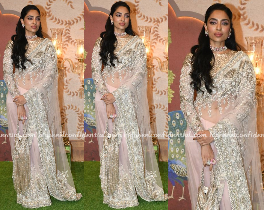 Sara was seen in two Iqbal Hussain looks back to back, wearing a colorful lehenga from the Pakistani designer to the wedding on Friday and then a more muted white and gold one to the aashirwad ceremony on Saturday. Both lehengas were droolworthy and she looked nice in them. I do have to point out though, the cream/white one was a bit too long on her.
