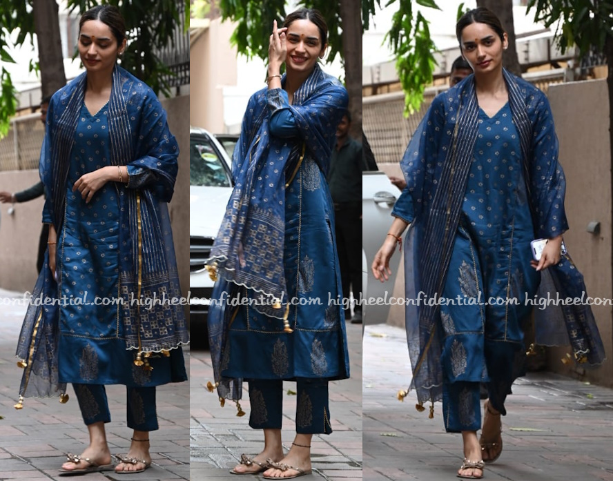 Manushi was spotted out on Sunday wearing a blue block print kurta set. She looked lovely in it.