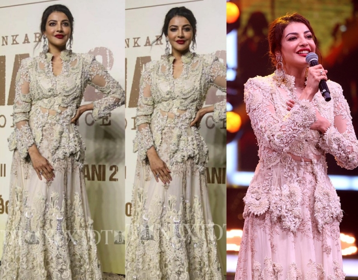 Kajal was seen at the audio launch of a movie wearing an ivory Anamika Khanna jacket and skirt set paired with earrings from Ritika Sachdeva. It’s a good thing she added the red lip but somehow didn’t care for the lehenga much.