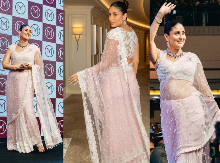 Kareena attended the launch of a jewellery store in Abu Dhabi wearing a pale pink sari from Manish Malhotra. Like the sari?